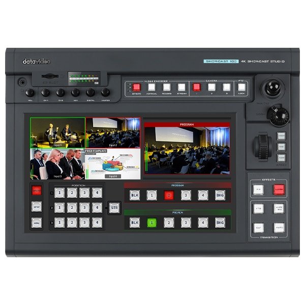 Le Datavideo Showcast 100 est un mélangeur avec écran tactile 4K à 4 canaux qui comporte 7 fonctions principales. Il peut commuter la vidéo, superposer du texte et des graphiques, contrôler les caméras, diffuser en direct, enregistrer et mixer l’audio, le tout à partir d’une seule unité. Semblable à une tablette, l’écran tactile de 14 pouces permet un accès facile et intuitif aux fonctions du sélecteur.