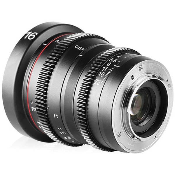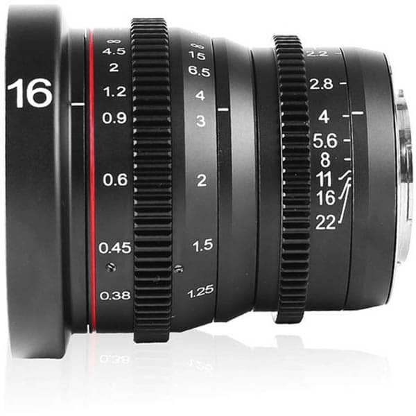 Des repères d’échelle sont fournis en pieds et en mètres, et une rotation de mise au point de 270° permet un réglage manuel de la mise au point avec précision. Avec une distance focale de 16mm, cet objectif cinéma a un angle de vue horizontal de 61° et une distance de mise au point minimale de 20cm.