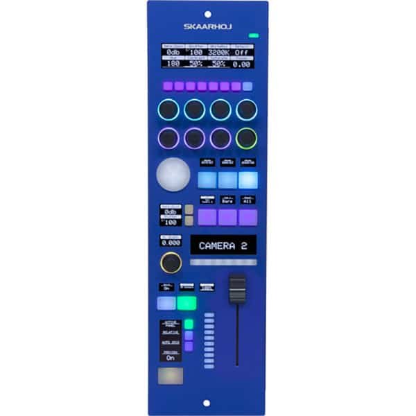 Le Skaarhoj RCPv2 avec Fader Motorisé est un panneau de contrôle de caméra à distance polyvalent et programmable. Il peut s’insérer dans un rack ou se poser sur une table. Il intègre un joystick à iris classique avec un écran et une barre LED ainsi que des knobs d’encodeur, un joystick pad, des écrans OLED, un bouton de prévisualisation, des boutons à quatre voies et un bouton Master. Cette version dispose également d’un fader motorisé. Le RCPv2 exécute le système d’exploitation open source UniSketch développé par SKAARHOJ, qui est programmable par l’utilisateur pour s’adapter à des flux de travail spécifiques. La technologie PoE simplifie la configuration en permettant aux signaux et à l’alimentation de circuler via un seul câble.